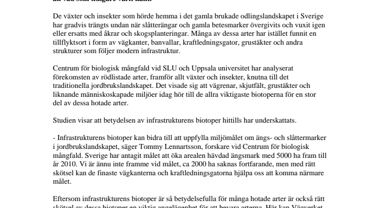 - Infrastrukturens biotoper kan bidra till att uppfylla miljömålet om ängs- och slåttermarker i jordbrukslandskapet, säger Tommy Lennartsson, forskare vid Centrum för biologisk mångfald. Sverige har antagit målet att öka arealen hävdad ängsmark med 5000 ha fram till år 2010. Vi är ännu inte framme vid målet, ca 2000 ha saknas fortfarande, men med rätt skötsel kan de finaste vägkanterna och kraftledningsgatorna hjälpa oss att komma närmare målet.