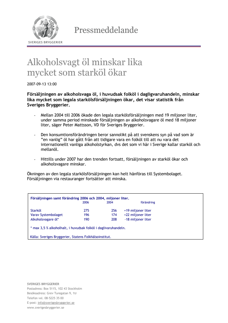 - Mellan 2004 till 2006 ökade den legala starkölsförsäljningen med 19 miljoner liter, under samma period minskade försäljningen av alkoholsvagare öl med 18 miljoner liter, säger Peter Mattsson, VD för Sveriges Bryggerier.
