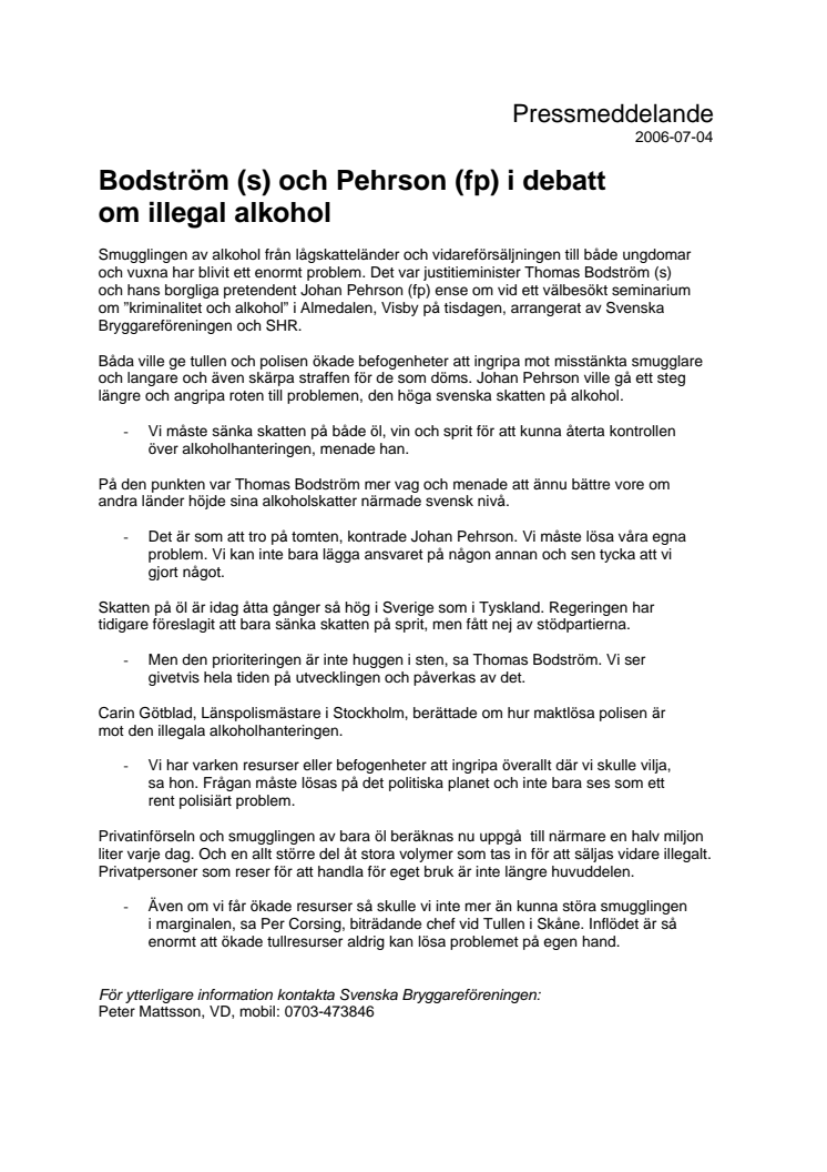 Smugglingen av alkohol från lågskatteländer och vidareförsäljningen till både ungdomar och vuxna har blivit ett enormt problem. Det var justitieminister Thomas Bodström (s) och hans borgliga pretendent Johan Pehrson (fp) ense om vid ett välbesökt seminarium om kriminalitet och alkohol i Almedalen, Visby på tisdagen, arrangerat av Svenska Bryggareföreningen och SHR.