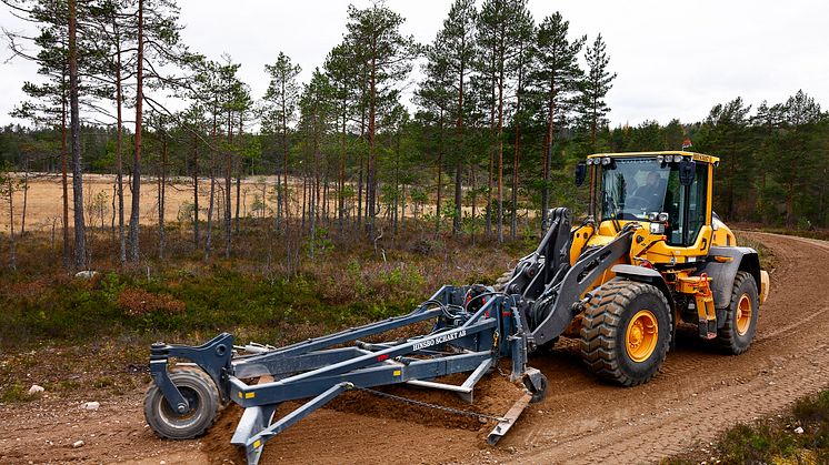 Hinsbo Schakt jobbar huvudsakligen åt skogsbolag i regionen och sköter underhåll och snöröjning på ett finmaskigt nät av skogsbilvägar. Rikard årsgamla Volvo L90H är utrustad med vägsladd fram för underhåll på sommaren. På vintern byts det mot plog, isriv och sandskopa.