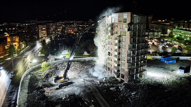Nu är två av Kirunas mest välkända profilbyggnader – höghusen Snusdosan och Spottkoppen, tolv respektive tio våningar höga – rivna. I huvudrollen: Volvos jätte EC750E High Reach.