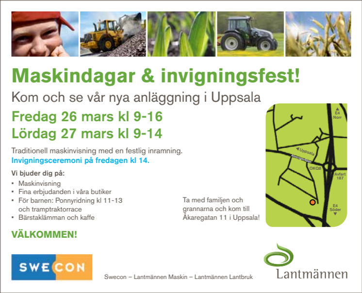 Swecon och Lantmännen bjuder in till maskindagar och invigningsfest i Uppsala 26-27 mars!