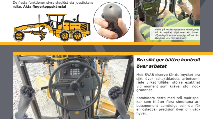 Moderna väghyvlar utrustas med allt mer avancerade styrsystem. För att ta fram ett styrsystem som passar en Volvo väghyvelförare inledde Swecon ett samarbete med SVAB Hydraulik AB som är stora inom bland annat rotortiltstyrningar. Målet var en hyttmiljö med bra sikt, god ergonomi och ett styrsystem som gör jobbet med stor precision.