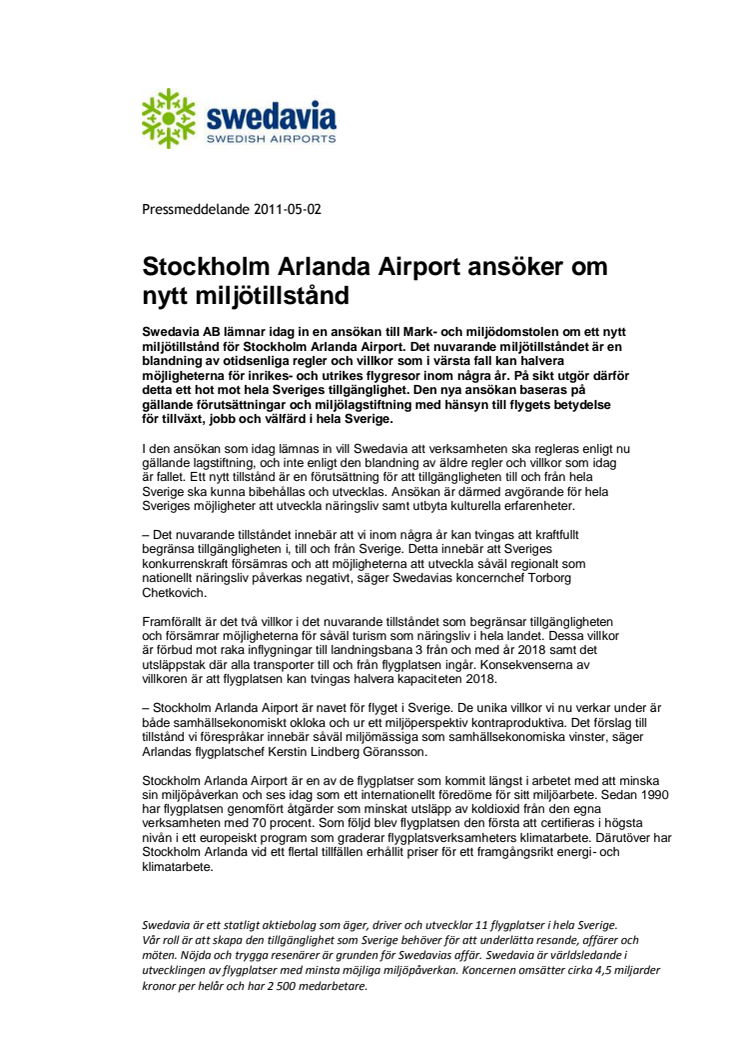 – Stockholm Arlanda Airport är navet för flyget i Sverige. De unika villkor vi nu verkar under är både samhällsekonomiskt okloka och ur ett miljöperspektiv kontraproduktiva. Det förslag till tillstånd vi förespråkar innebär såväl miljömässiga som samhällsekonomiska vinster, säger Arlandas flygplatschef Kerstin Lindberg Göransson.