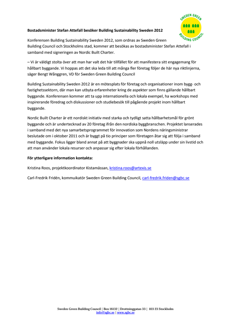 Konferensen Building Sustainability Sweden 2012, som ordnas av Sweden Green Building Council och Stockholms stad, kommer att besökas av bostadsminister Stefan Attefall i samband med signeringen av Nordic Built Charter.