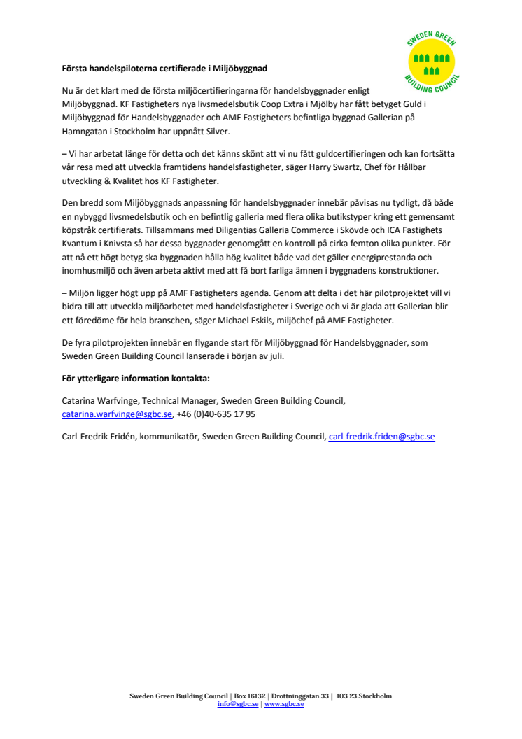 Nu är det klart med de första miljöcertifieringarna för handelsbyggnader enligt Miljöbyggnad. KF Fastigheters nya livsmedelsbutik Coop Extra i Mjölby har fått betyget Guld i Miljöbyggnad för Handelsbyggnader och AMF Fastigheters befintliga byggnad Gallerian på Hamngatan i Stockholm har uppnått Silver.