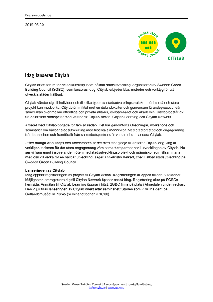 Citylab är ett forum för delad kunskap inom hållbar stadsutveckling, organiserad av Sweden Green Building Council (SGBC), som lanseras idag. Citylab erbjuder bl.a. metoder och verktyg för att utveckla städer hållbart. Citylab vänder sig till individer och till olika typer av stadsutvecklingsprojekt – både små och stora projekt kan medverka.