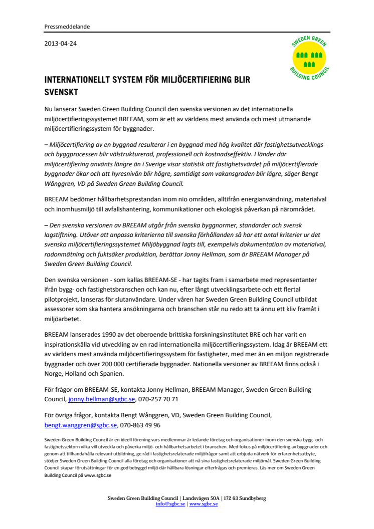 Nu lanserar Sweden Green Building Council den svenska versionen av det internationella miljöcertifieringssystemet BREEAM, som är ett av världens mest använda och mest utmanande miljöcertifieringssystem för byggnader.