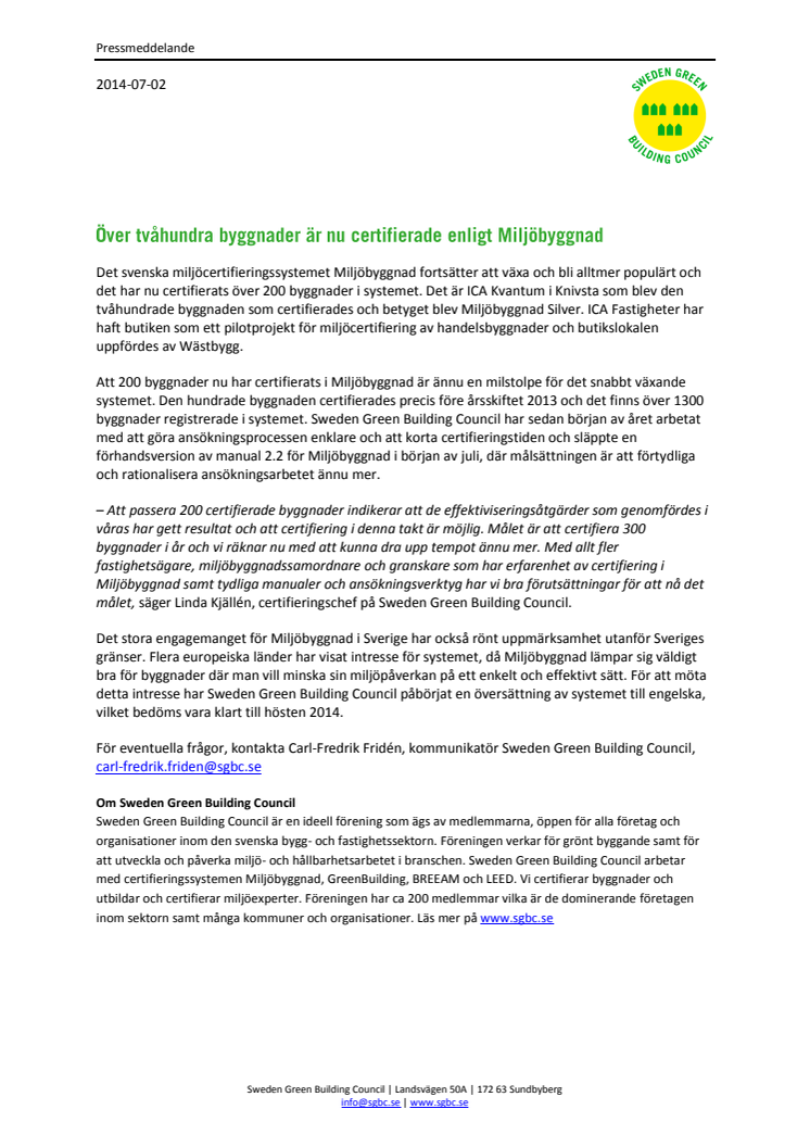 Det svenska miljöcertifieringssystemet Miljöbyggnad fortsätter att växa och bli alltmer populärt och det har nu certifierats över 200 byggnader i systemet. Det är ICA Kvantum i Knivsta som blev den tvåhundrade byggnaden som certifierades och betyget blev Miljöbyggnad Silver.