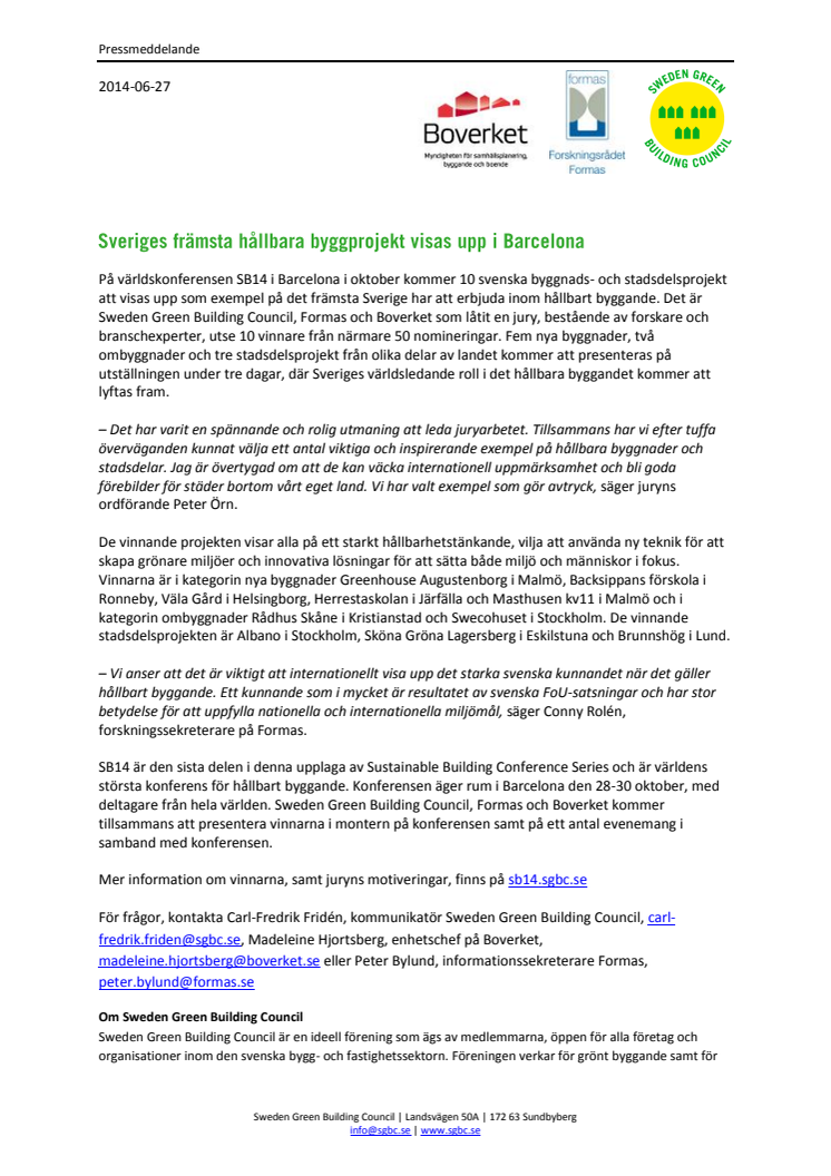På världskonferensen SB14 i Barcelona i oktober kommer 10 svenska byggnads- och stadsdelsprojekt att visas upp som exempel på det främsta Sverige har att erbjuda inom hållbart byggande. Det är Sweden Green Building Council, Formas och Boverket som låtit en jury, bestående av forskare och branschexperter, utse 10 vinnare från närmare 50 nomineringar.