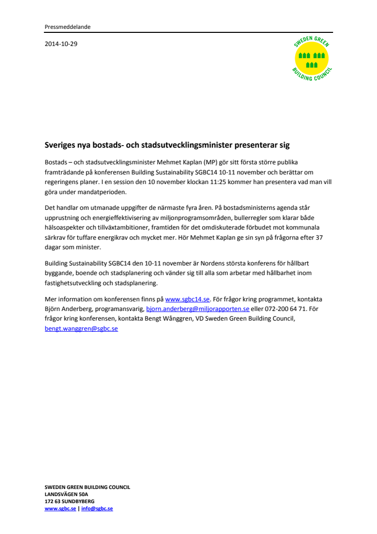 Bostads – och stadsutvecklingsminister Mehmet Kaplan (MP) gör sitt första större publika framträdande på konferensen Building Sustainability SGBC14 10-11 november och berättar om regeringens planer. I en session den 10 november klockan 11:25 kommer han presentera vad man vill göra under mandatperioden.