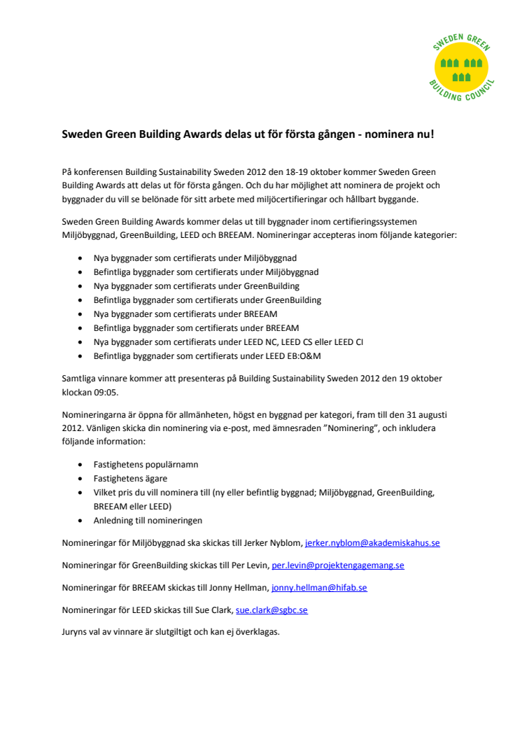 På konferensen Building Sustainability Sweden 2012 den 18-19 oktober kommer Sweden Green Building Awards att delas ut för första gången. Och nu finns det möjlighet att nominera de projekt och byggnader som man vill se belönade för sitt arbete med miljöcertifieringar och hållbart byggande.