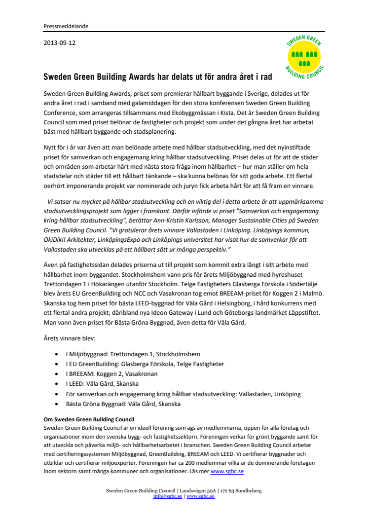 Sweden Green Building Awards, priset som premierar hållbart byggande i Sverige, delades ut för andra året i rad i samband med galamiddagen för den stora konferensen Sweden Green Building Conference. Det är Sweden Green Building Council som med priset belönar de fastigheter och projekt som under det gångna året har arbetat bäst med hållbart byggande och stadsplanering.