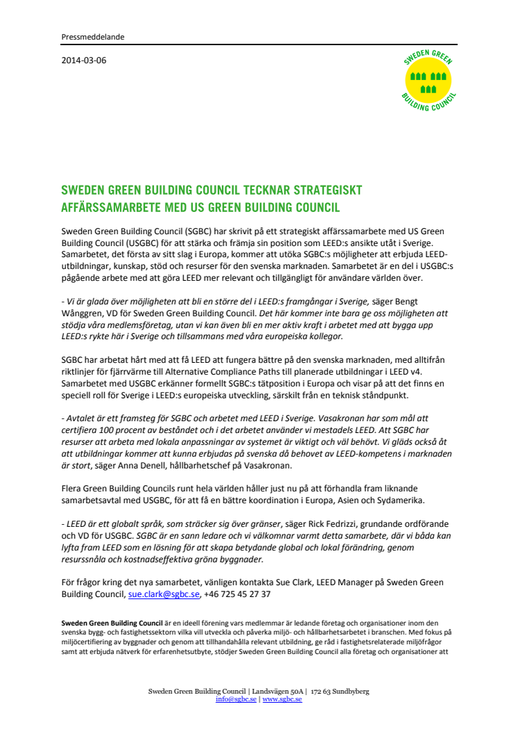 Sweden Green Building Council (SGBC) har skrivit på ett strategiskt affärssamarbete med US Green Building Council (USGBC) för att stärka och främja sin position som LEED:s ansikte utåt i Sverige. Samarbetet, det första av sitt slag i Europa, kommer att utöka SGBC:s möjligheter att erbjuda LEED-utbildningar, kunskap, stöd och resurser för den svenska marknaden.