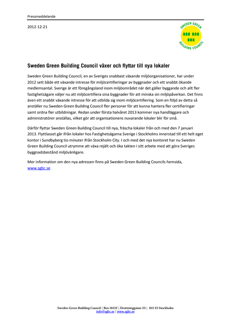 Sweden Green Building Council, en av Sveriges snabbast växande miljöorganisationer, har under 2012 sett både ett växande intresse för miljöcertifieringar av byggnader och ett snabbt ökande medlemsantal. Därför flyttar Sweden Green Building Council till nya, fräscha lokaler från och med den 7 januari 2013.