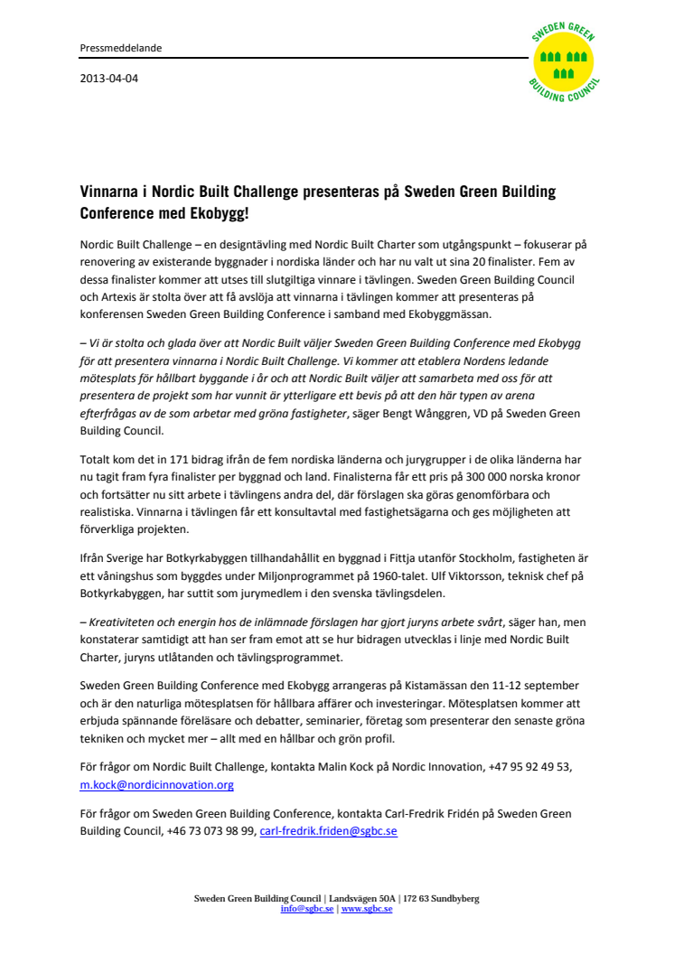 Nordic Built Challenge fokuserar på renovering av existerande byggnader i nordiska länder och har nu valt ut sina 20 finalister. Fem av dessa finalister kommer att utses till slutgiltiga vinnare i tävlingen. Sweden Green Building Council och Artexis är stolta över att få avslöja att vinnarna kommer att presenteras på konferensen Sweden Green Building Conference i samband med Ekobyggmässan.