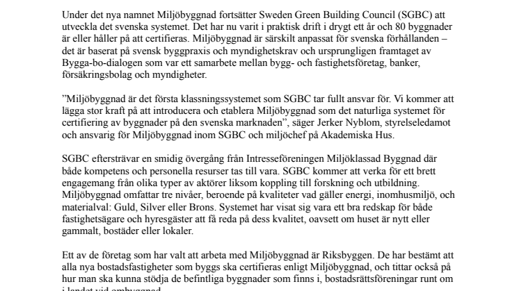 • Miljöklassad Byggnad blir Miljöbyggnad – ett prisvärt svenskt miljösystem
