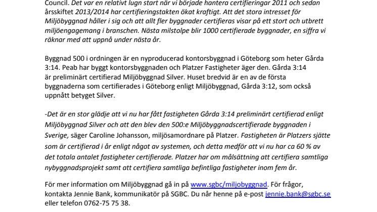 -Det är en stor glädje att vi nu har fått fastigheten Gårda 3:14 preliminärt certifierad enligt Miljöbyggnad Silver och att den blev den 500:e Miljöbyggnadscertifierade byggnaden i Sverige, säger Caroline Johansson, miljösamordnare på Platzer. Fastigheten är Platzers sjätte som är certifierad i år enligt något av systemen, och detta medför att vi nu har ca 60 % av det totala antalet fastigheter certifierade. Platzer har om målsättning att certifiera samtliga nybyggnadsprojekt samt att certifiera samtliga befintliga fastigheter inom fem år.