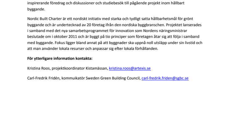 Nordic Built Charter är ett nordiskt initiativ med starka och tydligt satta hållbarhetsmål för grönt byggande och är undertecknad av 20 företag ifrån den nordiska byggbranschen. Projektet lanserades i samband med det nya samarbetsprogrammet för innovation som Nordens näringsministrar beslutade om i oktober 2011 och är byggt på tio principer som företagen åtar sig att följa i samband med byggande. Fokus ligger bland annat på att byggnader ska uppnå noll utsläpp under sin livstid och att man använder lokala resurser och anpassar sig efter lokala förhållanden.