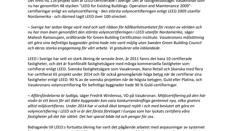 Det finns nu 116 projekt som är LEED-certifierade i Sverige. Det är fastighetsbolaget Vasakronan som nu har genomfört 48 stycken "LEED for Existing Buildings: Operation and Maintenance 2009"-certifieringar enligt en volymcertifiering - den största volymcertifieringen enligt LEED 2009 utanför Nordamerika - och därmed tagit LEED över 100-strecket.