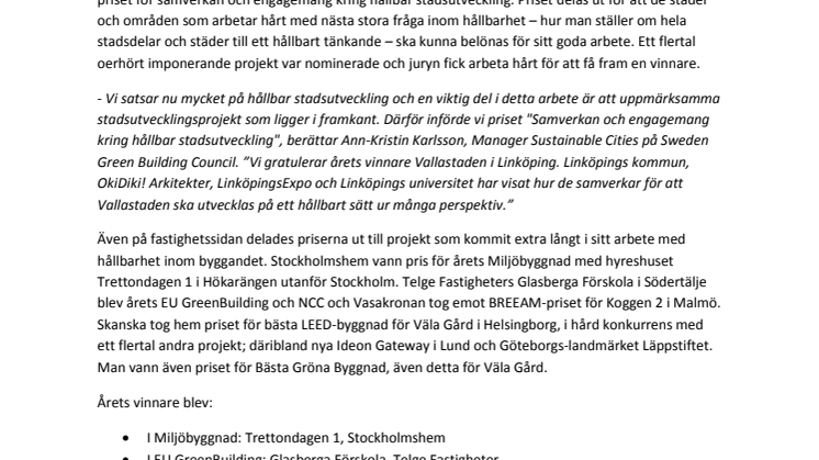 - Vi satsar nu mycket på hållbar stadsutveckling och en viktig del i detta arbete är att uppmärksamma stadsutvecklingsprojekt som ligger i framkant. Därför införde vi priset "Samverkan och engagemang kring hållbar stadsutveckling", berättar Ann-Kristin Karlsson, Manager Sustainable Cities på Sweden Green Building Council. ”Vi gratulerar årets vinnare Vallastaden i Linköping. Linköpings kommun, OkiDiki! Arkitekter, LinköpingsExpo och Linköpings universitet har visat hur de samverkar för att Vallastaden ska utvecklas på ett hållbart sätt ur många perspektiv.”