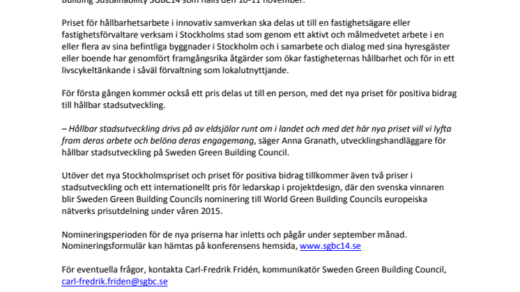 Sweden Green Building Awards - den svenska bygg- och fastighetsbranschens stora prisutdelning för hållbart byggande - har utökats med fem priskategorier. Bland de nya priserna finns bland annat ett nyinstiftat pris för hållbarhetsarbete i innovativ samverkan, framtaget av Stockholms stads forum för hållbara fastigheter. Priserna kommer att delas ut på en galamiddag, i samband med konferensen Building Sustainability SGBC14 som hålls den 10-11 november.