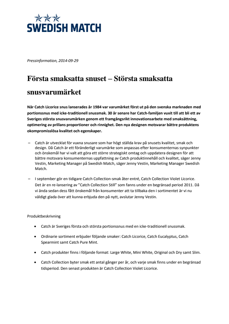 När Catch lanserades 1984 var varumärket först ut på den svenska marknaden med portionssnus med icke-traditionell snussmak. 30 år senare har Catch-familjen vuxit till att bli ett av Sveriges största snusvarumärken genom ett framgångsrikt innovationsarbete med smaksättning och optimering av prillans proportioner. Den nya designen motsvarar bättre produktens okompromisslösa kvalitet och egenskaper.