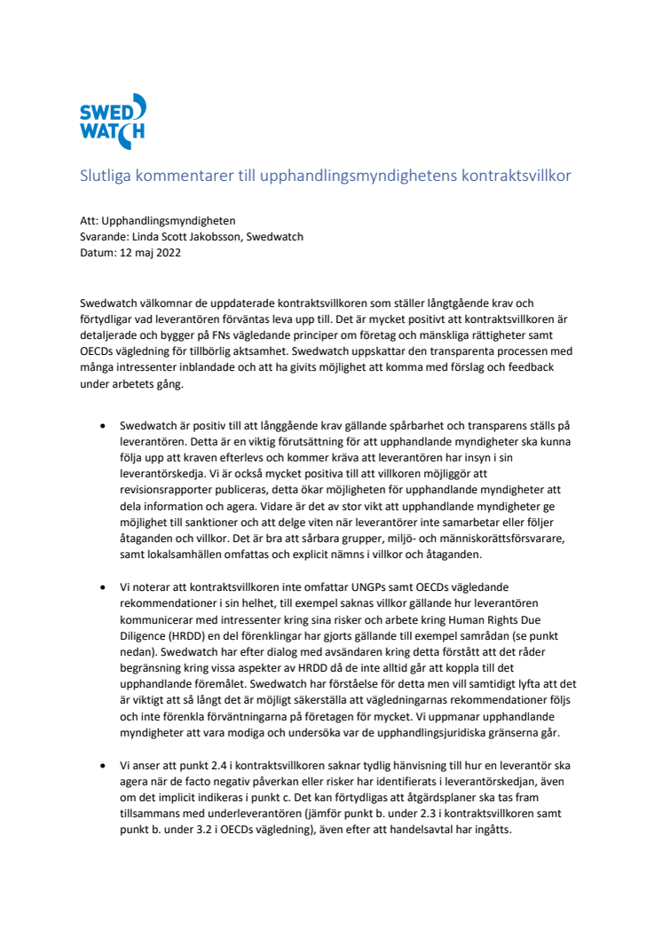 Swedwatch kommentarer till kontraktsvillkoren finns bifogat som pdf.