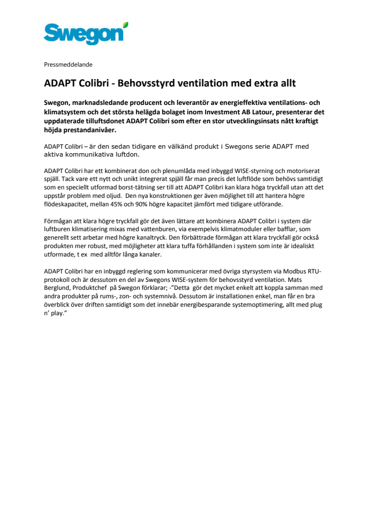 Swegon, marknadsledande producent och leverantör av energieffektiva ventilations- och klimatsystem och det största helägda bolaget inom Investment AB Latour, presenterar det uppdaterade tilluftsdonet ADAPT Colibri som efter en stor utvecklingsinsats nått kraftigt höjda prestandanivåer.
