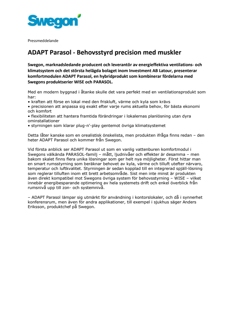 Swegon, marknadsledande producent och leverantör av energieffektiva ventilations- och klimatsystem och det största helägda bolaget inom Investment AB Latour, presenterar komfortmodulen ADAPT Parasol, en hybridprodukt som kombinerar fördelarna med Swegons produktserier WISE och PARASOL.