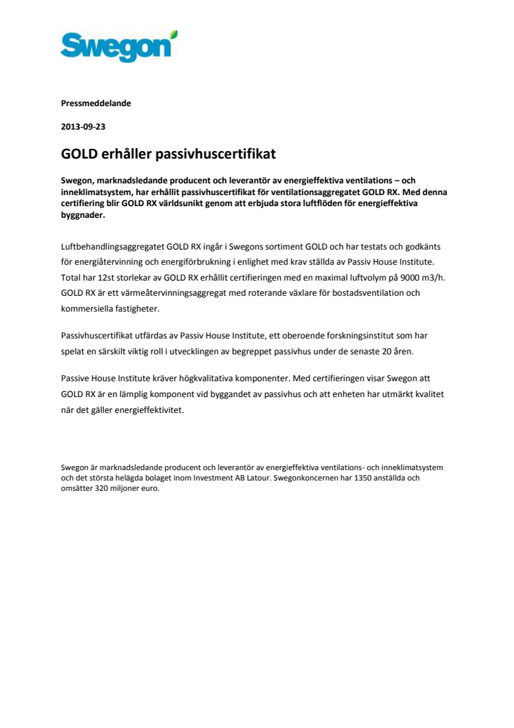 Swegon, marknadsledande producent och leverantör av energieffektiva ventilations – och inneklimatsystem, har erhållit passivhuscertifikat för ventilationsaggregatet GOLD RX. Med denna certifiering blir GOLD RX världsunikt genom att erbjuda stora luftflöden för energieffektiva byggnader.