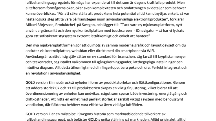 Under dessa år har GOLD:s hårdvara, styrning och funktionalitet uppdaterats kontinuerligt och luftbehandlingsaggregatets förmåga har expanderat till det som är dagens kraftfulla produkt. Men allteftersom förmågorna ökar, ökar även komplexiteten och omfattningen av detaljer som behöver kunna överblickas. ”För att säkerställa att produktens hela potential alltid kan utnyttjas enkelt, så var nästa logiska steg att ta vara på framstegen inom användarvänliga elektronikprodukter”, förklarar Mikael Börjesson, Produktchef på Swegon, och lägger till: ”Tack vare ny mjukvaruplattform, nytt användargränssnitt och den nya kontrollplattan med touchscreen - IQnavigator – så har vi lyckats göra ett sofistikerat styrsystem extremt lättåtkomligt och enkelt att hantera”.