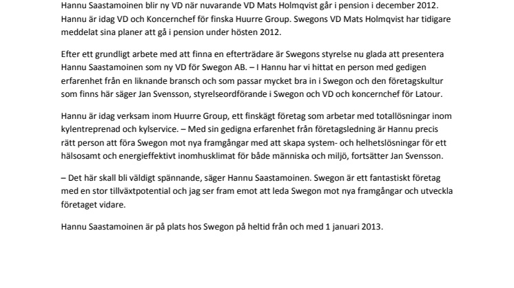Hannu Saastamoinen blir ny VD när nuvarande VD Mats Holmqvist går i pension i december 2012. Hannu är idag VD och koncernchef för finska Huurre Group. Swegons VD Mats Holmqvist har tidigare meddelat sina planer att gå i pension under hösten 2012.