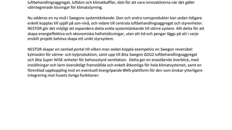 Nu adderas en ny nivå i Swegons systemtänkande. Don och andra rumsprodukter kan sedan tidigare enkelt kopplas till spjäll på zon-nivå, och vidare till centrala luftbehandlingsaggregat och styrenheter. NESTOR gör det möjligt att expandera detta enkla systemtänkande till större system. Allt detta för att skapa energieffektiva och ekonomiska helhetslösningar, utan att tid och pengar läggs på att i varje enskilt projekt behöva skapa ett unikt styrsystem.