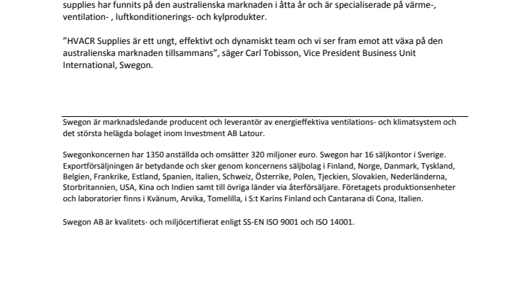 ”HVACR Supplies är ett ungt, effektivt och dynamiskt team och vi ser fram emot att växa på den australienska marknaden tillsammans”, säger Carl Tobisson, Vice President Business Unit International, Swegon.