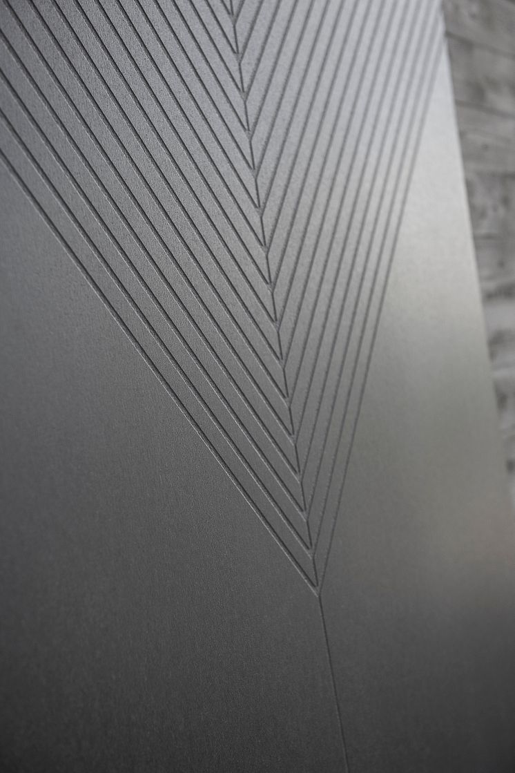 Närbild på fiskbensmönstrade Cembrit Patina Singature i EgnellAllard designserie, mönstret är blästrat i den genomfärgade skivan. Mönstret heter CHEVRON.