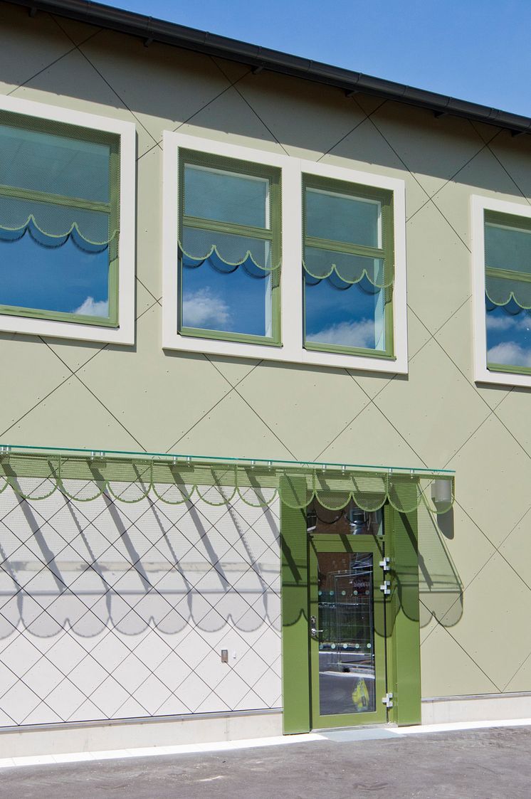 Grönmossens förskola i Bagarmossen Stockholm. Brandsäker fasad i fibercement. Foto Cembrit