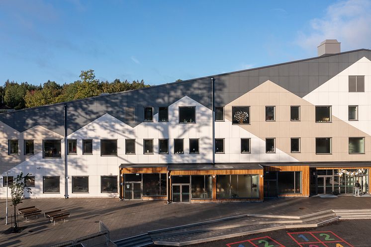 Fasadbilden visar det unika mönstret som designats för denna skola med linjerade fasadskivor i kombination med träpaneler