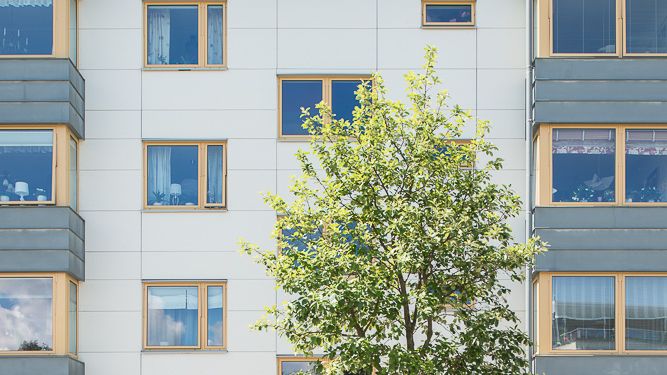 På sidan 23 kan man läsa om den nya fasadbeklädnaden som skall tåla tidens tand. Det handlar om en bostadsrättsförening som råkat illa ut med fuktskadad puts som nu har tryggare fasadskivor av fibercement som klimatskydd. Arkitekten Malin Unger hos Erséus Arkitekter berättar.