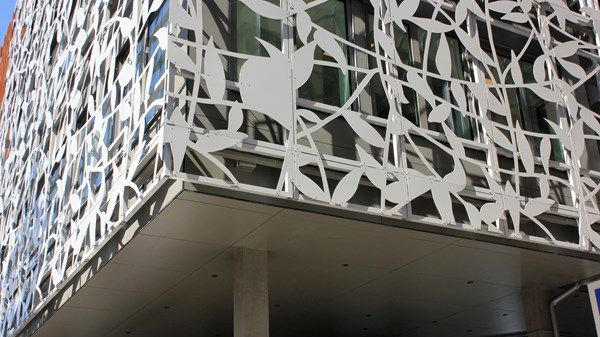 Tidigare på platsen fanns en möbelfabrik där möbelarkitekten Erik Chambert arbetade och det är från hans verk som bladmönstret på fasaden har hämtats.