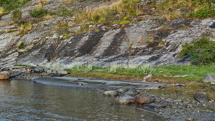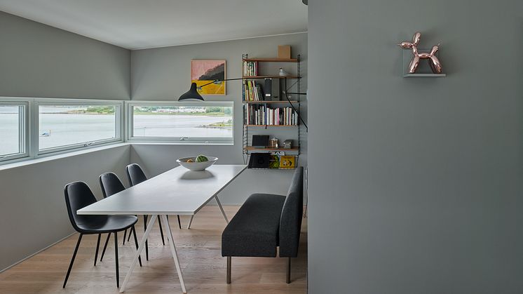 – Det finns flera skäl till att det blev just böljeplattor på fasaden. Vågformen associerar till det vågiga mönster som bildas på sjöbotten av vågorna här nedanför.Den grå färgen är precis rätt nyans mot de omgivande bergen. Den horisontella linjeringen i böljeplattorna förstärker husets form, samtidigt som de vertikala skarvarna har markerats svarta för att ge stadga åt huset, berättar Arne.