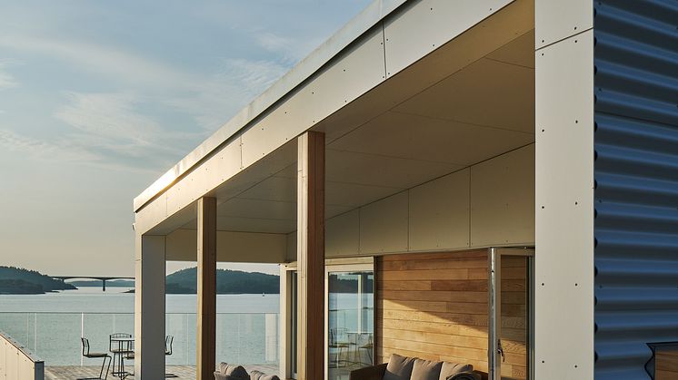 De vita släta fibercementskivorna Cembrit Solid används som undertak vid uteplatsen samt ovanför träpanelen.