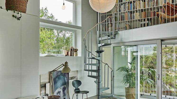 – Då behöver man inte ha stege när man ska olja in träet. Det är praktiskt och med uppljus mot de vita skivorna blir det ett underbart fint ljus!
