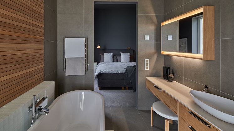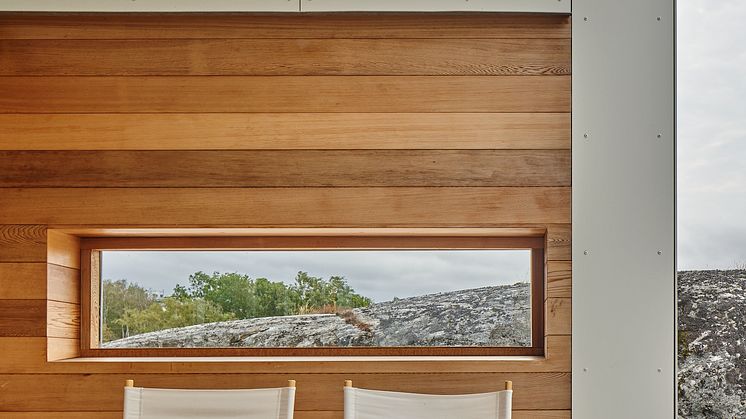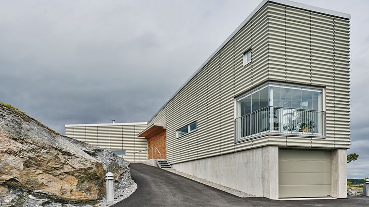 På en saltstänkt klippa i Bohuslän tronar en villa med säregen och spännande karaktär. Fasaden med vågiga böljeplattor i fibercement skyddar mot vädrets makter och flirtar med naturens eget formspråk. Oljat trä ger en varm ombonad känsla på umgängesytorna. Här bor arkitekten Arne och konstnären Soile w. Algeröd som har utformat huset tillsammans. Villan fick Stenungsunds byggnadspris 2019.