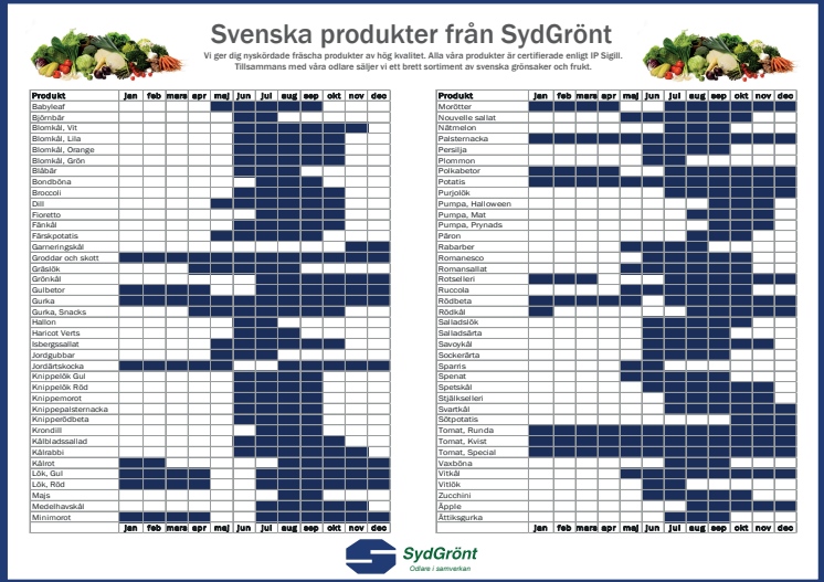 I SydGrönts produktkalender kan ni ser vilka grönsaker vi odlar och när dom är i säsong