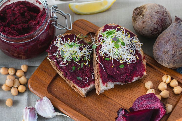 Enkelt, gott och väldigt vackert blir det när du gör denna hummus gjort på våra svenska förkokta rödbetor.