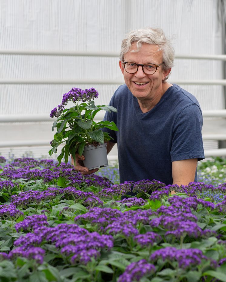 - Tror mig minnas tillbaka minst tio år, då jag fick frågan om att ta över produktionen av Heliotrop från en kollega i branschen som skulle pensionera sig. I kommersiell odling får du skaffa dig erfarenhet och en känsla för produkten för att göra en del viktiga insatser vid precis rätt tillfälle. Mjuktoppningen två veckor efter omplanteringen är en av de viktigaste, det fördröjer blomningen och därför stimuleras förgrening med påföljande tillväxt som då blir perfekt.