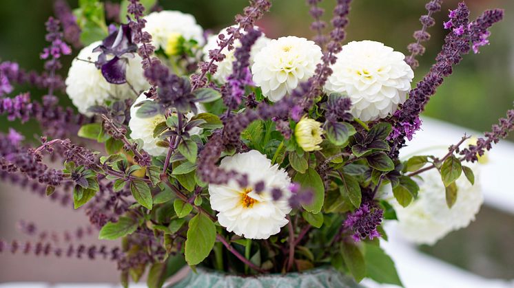 Blomsterbasilikans vackra spiror passar utmärkt som snittblommor. De ger en behaglig doft och en fräsch elegans till varje dukat bord.