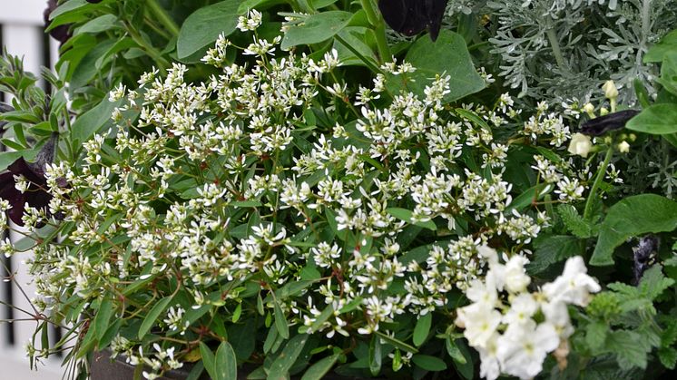Sobert, rent, sofistikerat! Svart petunia, vit verbena, silvergrå malört och många fler hittar du. Fint i betongkruka och galvaniserat kärl, stora och med bottenhål. När natten blivit ca 10°, kan du plantera. Tag bort plantkrukan, sätt ner klumpen i ny jord av finaste kvalitet, tryck till lätt, vattna. Efter en månad häller du svag näring i vattnet. Vattna tidig morgon eller sen kväll. Tag bort visset. En drömgrupp, helt rätt i tiden, att njuta av tills hösten kommer.