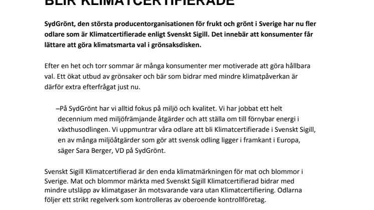 FLER GRÖNSAKER FRÅN SYDGRÖNT BLIR KLIMATCERTIFIERADE